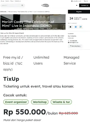 Travelku Demo adalah bagian dari TixUp untuk skenario pemesanan perjalanan. Menampilkan pencarian produk/jasa travel, jadwal, pemesanan, pembayaran, hingga e‑voucher/tiket.